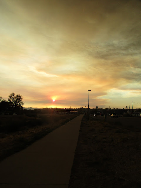 Monday. I'm out of my door and across the street, past a bus shelter where I used to catch the bus to work only a couple of years ago. On this morning, a guy is asleep on the benches. He's laying on his back and his arms are at his sides, as if someone put him down like this. He appears to be dressed in construction clothes. Scattered on the ground are copies of a religious tract in Spanish. In a short while, I'm rolling past the homeless RV camp. Little do I know, the scene here will be an entirely different and unexpected one 24 hours from now. This morning, there is a young guy coming toward me in my lane, of the bend in the road. He appears to have some kind of rollerblades on cowboy boots with silver tips. Coming back past here after work, off in the weeds by the river is a middle-aged woman in a neon yellow 2-piece swim suit. She's the last character I see before the following morning, when I am again approaching the entrance to this street. It's blocked off with yellow tape. A sing announcing the closure of the road is here, as ell as a couple of police cruisers from Denver Police, lights flashing. There's something goin' on. Whether it has anything to do with the homeless RV camp, only time will tell. I decide to take my chances with a side street. It goes up a steep hill to a highway. On one side is a sidewalk. On the opposite side is the light rail passenger train. I've never been this way. I short distance along, I suddenly recognize a building with a line of fake metal palm trees. I used to see them all the time from the train. The highway sidewalk takes me to another side street, which takes me to the other end of the street blocked off at one end. This end is also blocked off. I will have to wait and see what's cookin' when I come back this way after work. When I do, this end of the street is closed to "through traffic." I follow it to where the closure has been moved to the beginning of the RV camp. A single unmarked police car with lights flashing and an officer standing outside his vehicle are both in front of the yellow tape across the road. A couple of unwitting cars behind me must stop and turn around. The cops have been out here all day. The sun hangs low in a pall of fire smoke. Me wonders what shall be here at the morrow. When I make it back to my corner on my boulevard, a homeless camper with no front grill is parked and running at a curb. The guy inside appears to be looking at a map. From what I can see inside the camper, it's completely empty of any utilities, bed, sink, lavatory, stove, or anything. It looks inside like an empty van.