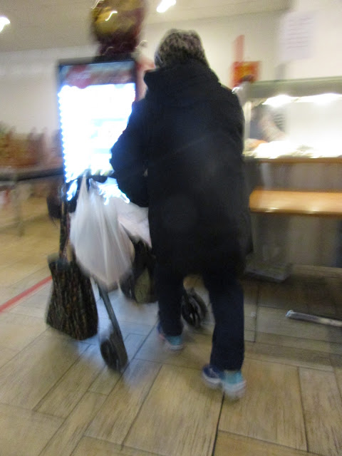Monday. The curb next to the open field is once again full of campers and a huge trailer. And a boat. And, down at the camp at the guardrail, I see the first camper. It will be gone by the evening. Just down from the guardrail camp is a guy with a big backpack. He's walking along the bike trail with a broom, and he's playing with individual pieces of trash. Mondays we are open an hour later than the rest of the week. And I end up staying an hour and a half after close. That's around the time we stayed open before the pandemic. It's somewhere between 8 and 9 PM when I'm coming around the first golf course I pass on the way home. The moon is out and providing light along the trail. I come up behind a homeless cyclist. They reflect no light but remain completely dark, in what appears to be a long black down coat. And they ride the line separating the two lanes of the trail, cruising along at a greatly reduced speed coming off a downhill stretch. This week with Christmas at the very end is a bit chaotic. My hours are bouncing around. Wednesday. I work open to close. The guy who showed up this year where I work, the guy who works on customer shoes, he's been raving about his electric bike. He doesn't need his one which is not electric anymore. He offers it to me for just $100. I grab it. It's not bad at all. But the rear tube has issues. I take it home on the bus. Along the way, a couple of homeless are shouting at each other on the train. One pulls out a stun gun to show the other. The following day I get a lot done before work. I make it to thew bank to deposit my Christmas bonus check, and order more checks. On the way home I pass a pedestrian on the bike trail. He's a homeless guy walking toward the guardrail camp. The previous evening, I passed a couple walking from the camp the other direction. Tonight, this guy turns to look at me with a ghostly expression. After I get home from work, I head over to the Chinese place for dinner. I ask about the woman with the walker. I'm told that she's been in there with her three grade school kids running around. Grandkids? And she's been witnessed being dropped off outside. She can walk fine without a walker.