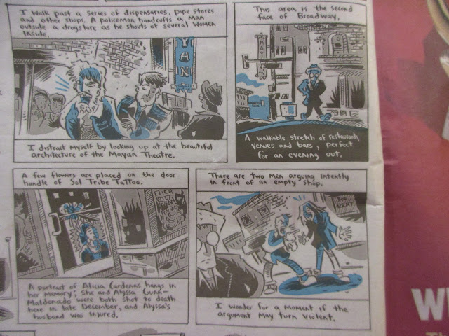 Monday. I'm on the way to work, coming down the long incline. Once again, three homeless dwellings are back along the curb. I turn the corner onto the block with the latest campers and shells along the open field. Tiny flakes are blowing down. A police cruiser is silently inching along the line of dwellings. Its lights are on. The officer is having a look. It's the first police I've seen at a homeless camp when a sweep is not in progress. The following morning, an unmarked police cruiser is parked at the opposite curb. Someone (the officer?) is speaking to the driver of a small car stopped ahead of me. The ride home from work takes me though a nonstop headwind. My visor comes loose and I remove it. For some reason, I'm hungry when I get home. Both Chinese places next to me are closed. I don't know what it is about Tuesdays and Chinese restaurants. I head over to the Vietnamese place behind where I live. It's about half Vietnamese families and half Caucasian university weirdo hipsters in knit hats. I sit next to a pair of white women. The older one is droning on in a monotone analysis of the significance of her life. On Wednesday, I'm on the connecting trail to work, passing under a couple of overpasses. It's a popular spot for homeless. One of them is in a bright purple wool coat, and they are banging on the frame of an overturned bicycle. I can think of no reason to do so. A different homeless person will be at this same spot, next to the same overturned bike, on my way home after work. Perhaps an hour later, I'm climbing the hill p from the block with the campers along the pen field. Gone is the camper with the trailer hitched to the rear. At the opposite curb at the crest of the hill are a small camper and a trailer. From inside one of them, I hear a male voice say, "I'm not getting high."